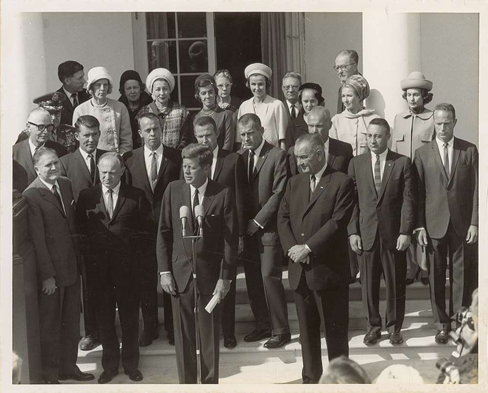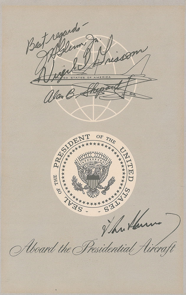 Air Force One in-flight booklet cover, 5 x 8, undated [but February 26, 1962] with an image of the aircraft and the presidential seal, with “Aboard the Presidential Aircraft,” printed along the bottom, signed near the bottom in black ink, “John F. Kennedy,” and signed near the top, “Best regards—J. H. Glenn, Jr.,” “Virgil I. Grissom,” and “Alan B. Shepard, Jr.” Grissom’s signature has been carefully traced over, probably by Grissom himself as it is in the same ink as the other signatures. In fine condition, with a uniform shade of mild toning from previous display, and some light mounting remnants to reverse. Accompanied by an unsigned vintage glossy 10 x 8 photo of Kennedy and all of the Mercury astronauts at the White House on October 10, 1963, where they were to receive the 1963 Collier Trophy.