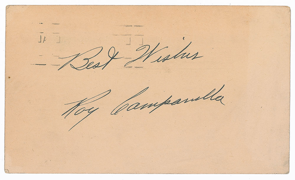 Vintage fountain pen signature, “Best wishes, Roy Campanella,” on an off-white 5.5 x 3.25 government postcard, postmarked February 18, 1950. In fine condition, with mild overall toning and some postmark ink slightly affecting the sentiment. Pre-certified Steve Grad/PSA/DNA and RR Auction COA.