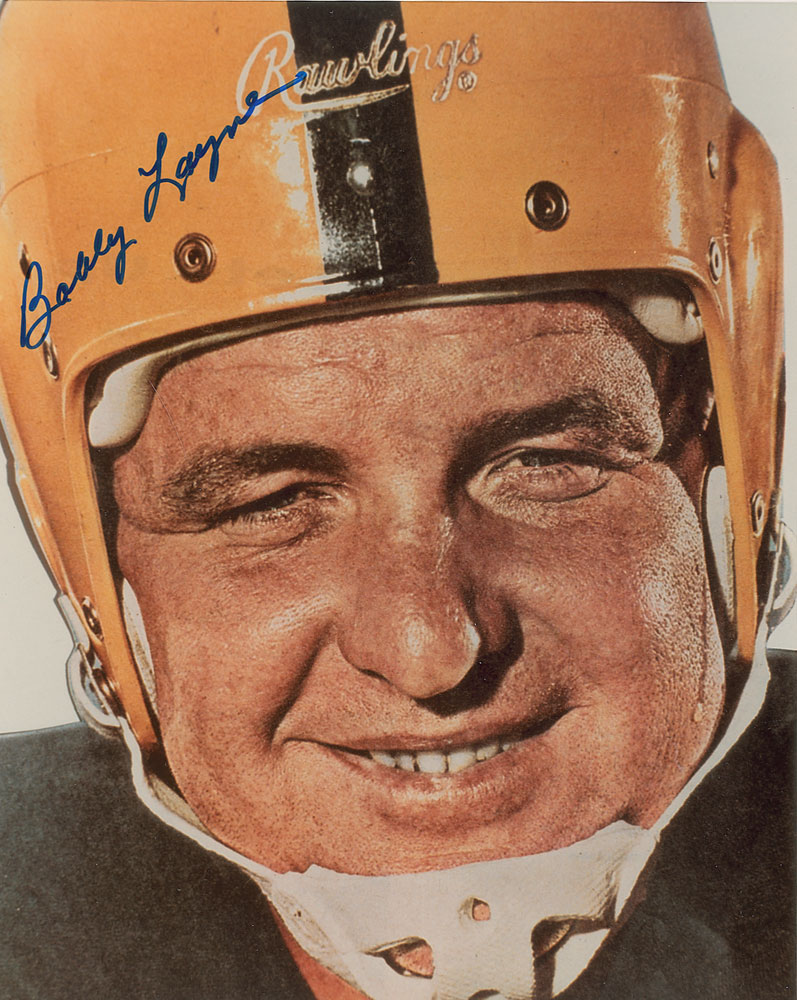 Color glossy 8 x 10 close-up photo of Layne in his football helmet, signed in blue felt tip. In fine condition. Pre-certified Steve Grad/PSA/DNA and RR Auction COA.