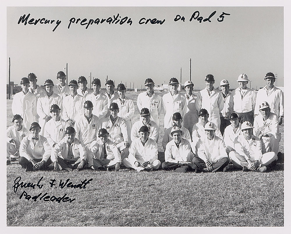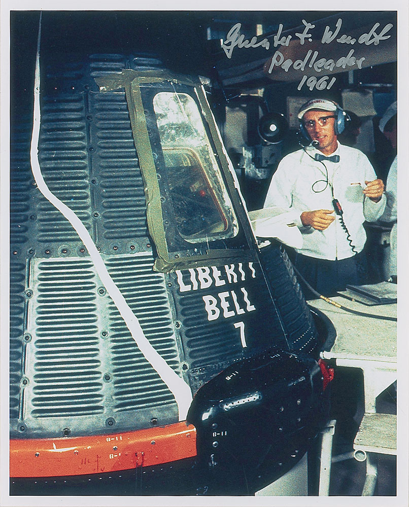 Two satin-finish photos: a color 8 x 10 of Wendt next to the Liberty Bell 7, signed in silver ink; and a 10 x 8 of the Mercury crew, signed in black felt tip, “Mercury preparation crew on Pad 5, Guenter F. Wendt Padleader.” In very fine condition. Pre-certified Steve Zarelli and RR Auction COA.