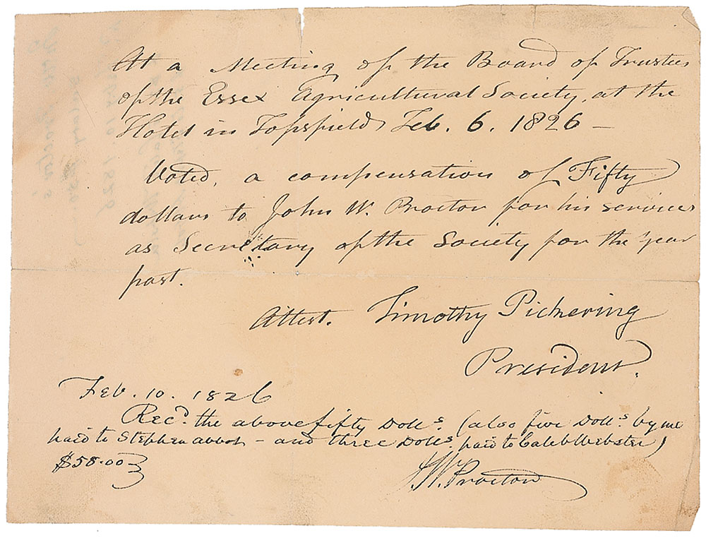 Postmaster general, secretary of war, and secretary of state under Washington (1745–1829). ADS, one page, 8 x 6, February 10, 1826. Financial document. In part: “At a meeting of the Board of Trustees of the Essex Agricultural Society, at the Hotel in Topsfield Feb. 6 1826.—Noted, a compensation of Fifty dollars to John W. Proctor for his services as Secretary of the Society for the year past.” Boldly signed at the conclusion by Pickering and countersigned by Proctor to confirm his receipt of the payment. Central vertical and horizontal folds (small edge separations) and a few creases, otherwise fine condition. Pre-certified PSA/DNA.