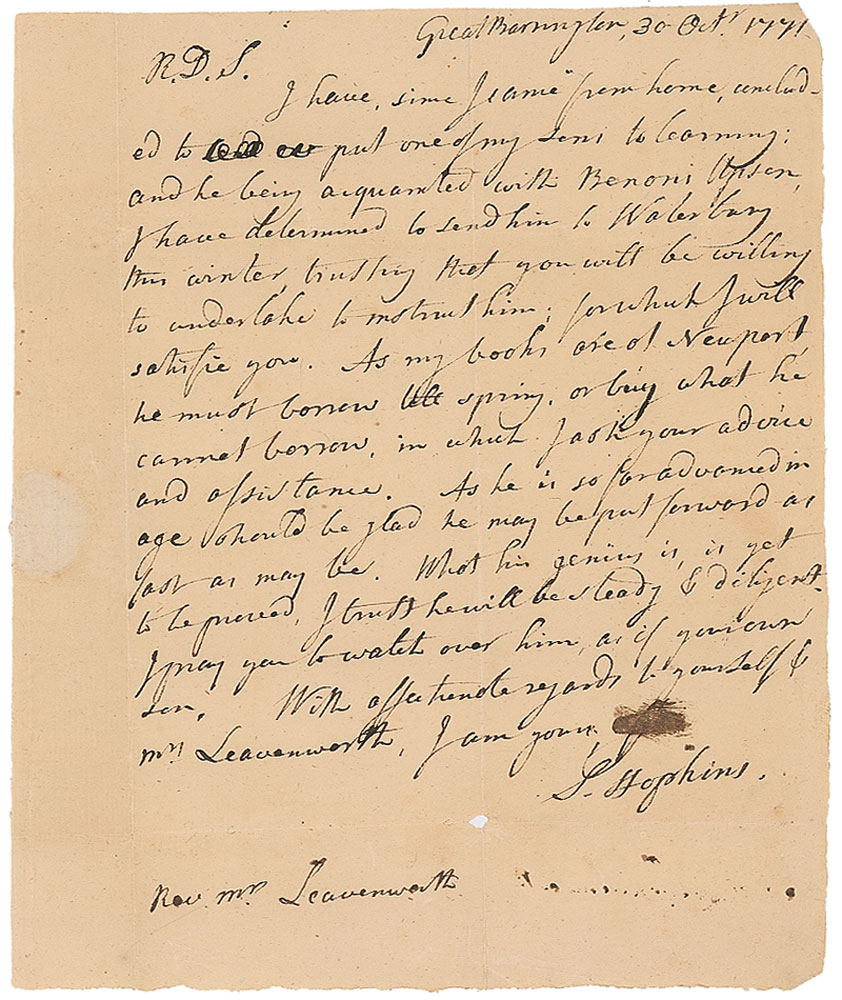 American clergyman (1721–1803) who founded the doctrine of Hopkinsian or New Divinity, a form of Calvinism that espoused free will and the denial of original sin. ALS signed “S. Hopkins,” one page, 6 x 7.5, October 30, 1771. Letter to his colleague Reverend Mark Leavenworth of Waterbury. In part: “I have, since I came from home, concluded to put one of my sons to learning…I have determined to send him to Waterbury this winter, trusting that you will be willing to undertake to instruct him; for which I would satisfie you. As my books are at Newport he must borrow till spring, or buy what he cannot borrow, in which I ask your assistance…What his genius is, is yet to be proved. I trust he will be steady & diligent.” Intersecting folds with one small hole, and scattered creases, otherwise fine condition. Accompanied by the original address panel. Pre-certified PSA/DNA and RR Auction COA.