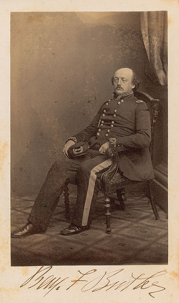 Original 2.5 x 4 carte-de-visite full-length portrait of of Butler seated and in uniform, signed in the lower border in black ink, “Benj. F. Butler.” Published by E. Anthony of New York. In fine condition, with some light scattered foxing to mount. Pre-certified PSA/DNA and RR Auction COA.