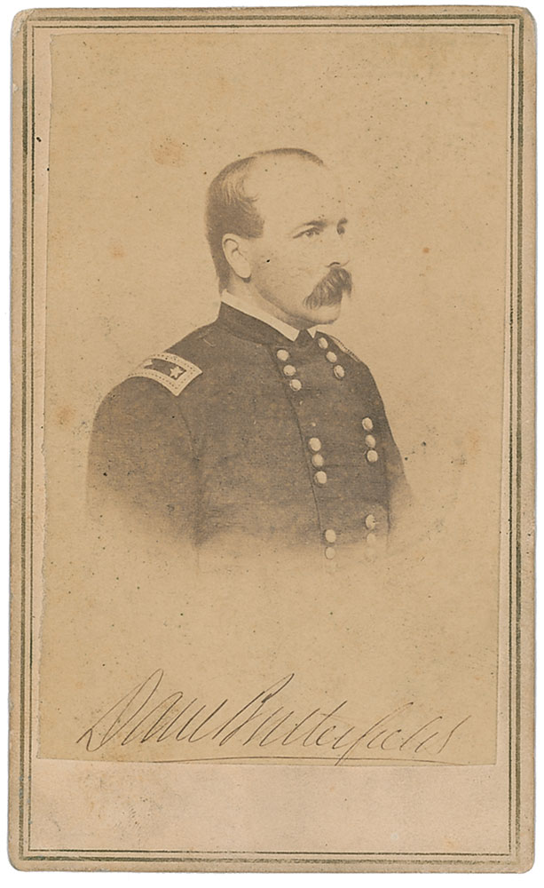 Union general (1831–1901) who saw action at Bull Run, Chancellorsville, and Gettysburg, as well as nearly all the engagements of the Peninsula Campaign and Sherman’s March to the Sea. He is generally credited as the composer of the bugle call ‘Taps.’ Original 2.25 x 4 carte-de-visite portrait of Butterfield in uniform, signed at the bottom of the image in black ink, “Danl. Butterfield.” Scattered surface marks and soiling, otherwise fine condition. Pre-certified PSA/DNA and RR Auction COA.