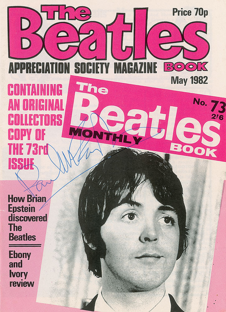 The Beatles Book magazine issue from May 1982, 6 x 8.25, 31 pages, signed on the front cover in blue ballpoint by McCartney. In fine condition. Accompanied by a certificate of authenticity from Tracks. The autograph was originally obtained at Elstree Studios on June 23, 1982, during the filming of Paul McCartney’s video for ‘Take It Away.’ Pre-certified Roger Epperson/REAL and RR Auction COA.