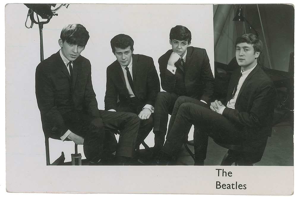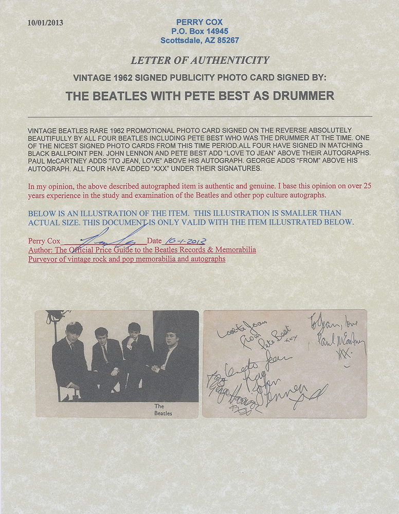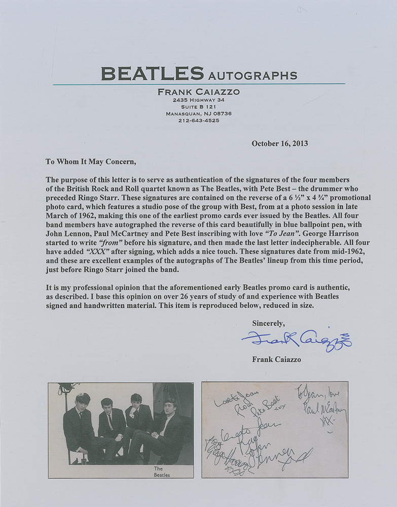 Vintage circa early 1962 promo card photo of the Beatles, 5.5 x 3.5, featuring a studio pose of the band clad in matching suits and sitting in a semi-circle, signed and inscribed on the reverse in black ballpoint, “To Jean, love Paul McCartney xxx,” “Love to Jean from Pete Best xxx,” “Love to Jean from John Lennon xxx,” and “Jean, George Harrison xxx.” In fine condition, with surface impressions to image from the crisp, bold signatures on reverse. Accompanied by letters of authenticity from noted Beatles experts Frank Caiazzo and Perry Cox. Caiazzo states that this image is from “a photo session in late March of 1962, making this one of the earliest promo cards ever issued by the Beatles.” Best would be replaced in August of 1962 by drummer Ringo Starr, making this a rare and especially desirable lineup. Pre-certified Roger Epperson/REAL and RR Auction COA.