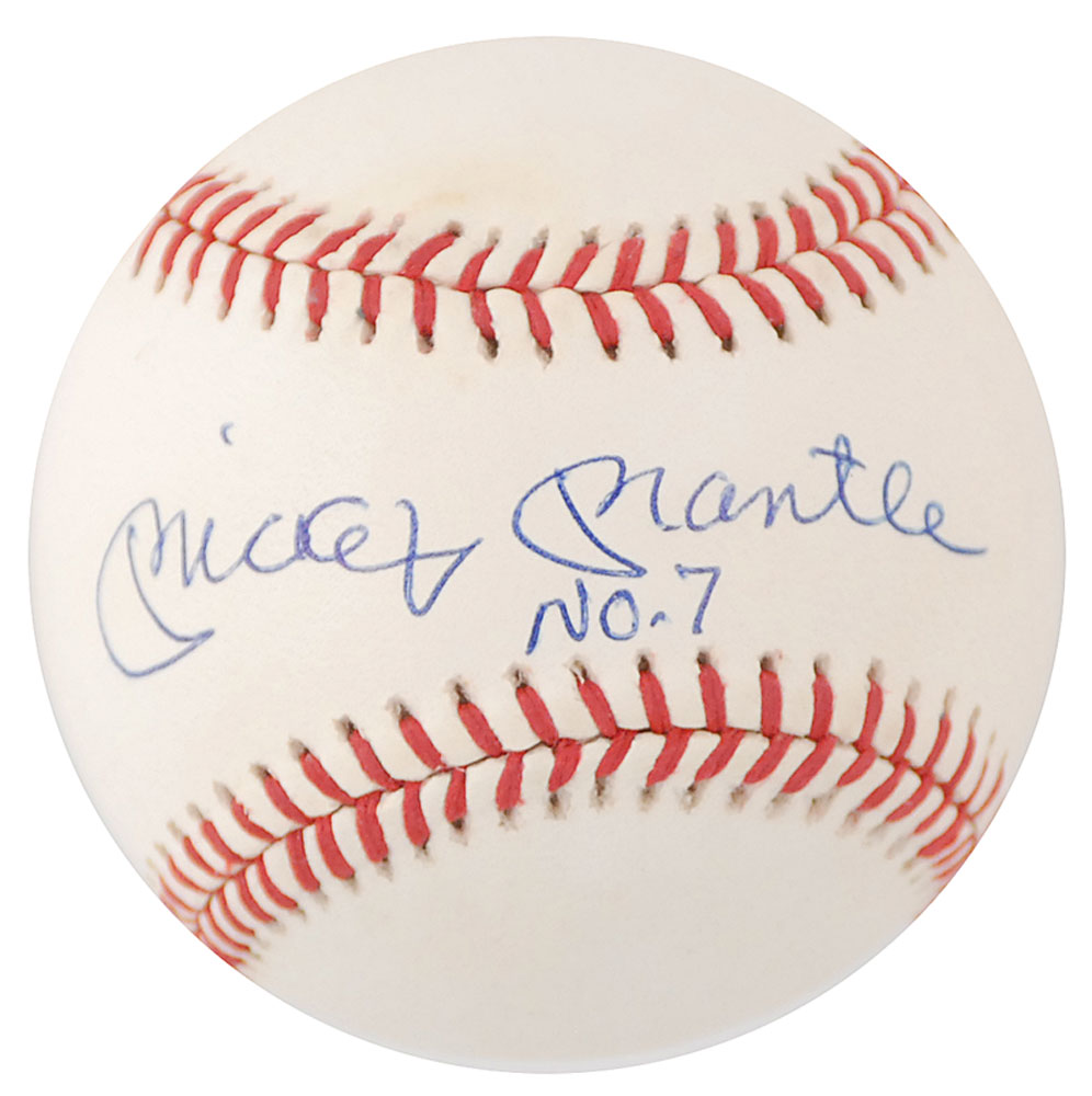Official Rawlings American League baseball signed in blue ballpoint on the sweet spot, “Mickey Mantle, No. 7.” In fine condition, with a light area of toning to upper panel. An especially sought after example, as Mantle adds his famous jersey number. Pre-certified Steve Grad/PSA/DNA and RR Auction COA.