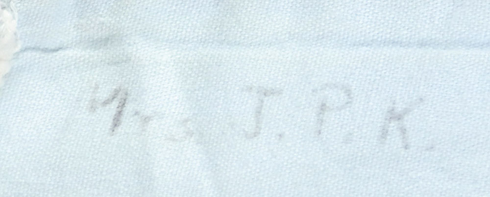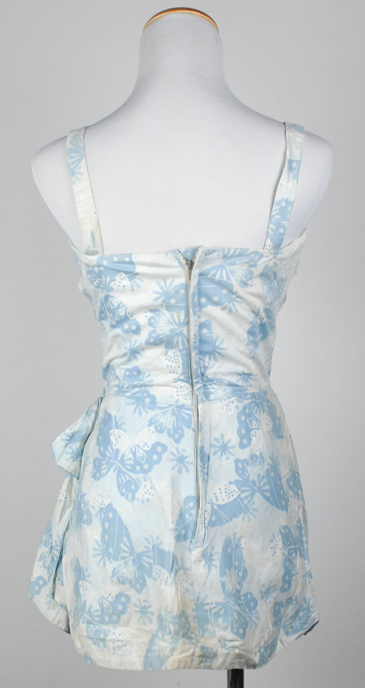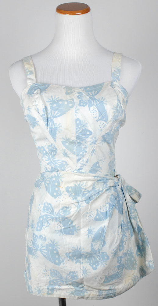 Kennedy's personally-owned and -worn bathing suit. Blue and white butterfly-print cotton one-piece sarong suit, size 14, has narrow shoulder straps and an adjustable belt on the front. Inside bears a “Reel Poise 4 Bestlyne Co. New York” manufacturer’s label and is also labeled on the inside in an unknown hand, “Mrs. J. B. K.” In fine condition, with scattered minor rust stains inside. Accompanied by a copy of a certificate of authenticity from Mary Gallagher, Kennedy’s personal secretary. Provenance: Robert L. White Collection, Guernsey’s, 2005. RR Auction COA.