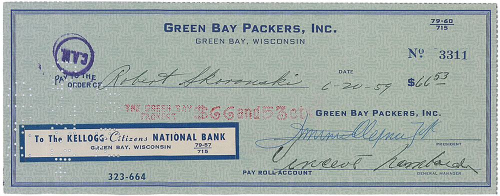 Green Bay Packers, Inc. business check, 8.25 x 3.25, filled out in another hand and signed by Lombardi, “Vincent Lombardi,” payable to Robert Skoronski for $66.53, June 20, 1959. Also endorsed on the reverse by Skoronski. In fine condition, with three vertical folds (one passing through a single letter of the signature), expected bank stamps and cancellation holes, and a bank label affixed to lower left. Skoronski started for the Packers for 11 years, most often at left tackle; he was a member of five of their championship teams and was elected to one Pro Bowl. Pre-certified Steve Grad/PSA/DNA and RR Auction COA.