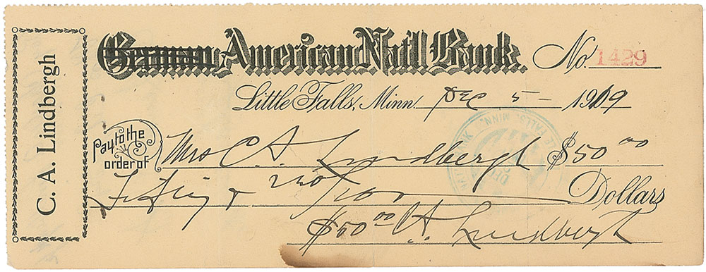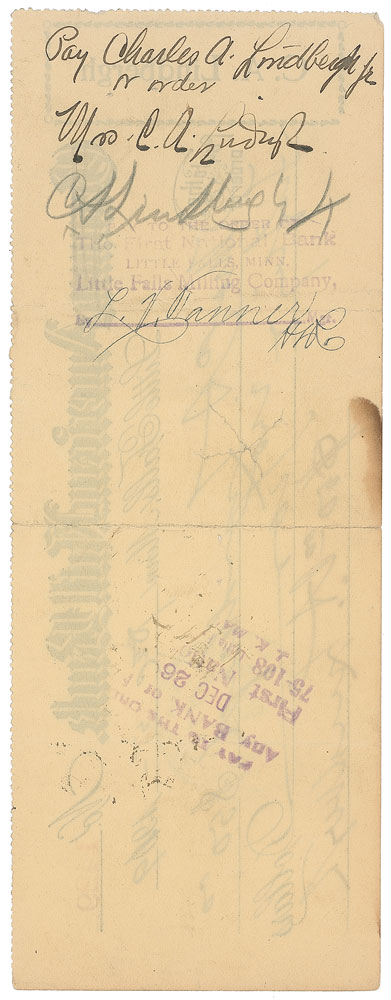Personal check, 8 x 3, filled out and signed by Charles A. Lindbergh, Sr., “C. A. Lindbergh,” payable to Mrs. C. A. Lindbergh for $50, December 5, 1919. Endorsed on the reverse by his wife, “Pay Charles A. Lindbergh, Jr., or order, Mrs. C. A. Lindbergh,” below which the future aviator signs in pencil, “C. A. Lindbergh, Jr.” Multiple vertical folds, unobtrusive cancellation cuts, and a small stain to lower edge, otherwise fine condition. Pre-certified PSA/DNA and RR Auction COA.