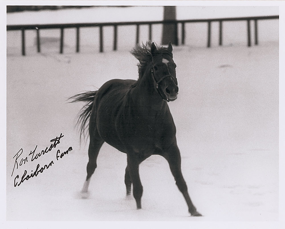 Nice 10 x 8 laser print photo of Secretariat in the snow, signed in black felt tip, “Ron Turcotte, Clairborne Farm.” In fine condition. Pre-certified Steve Grad/PSA/DNA and RR Auction COA.