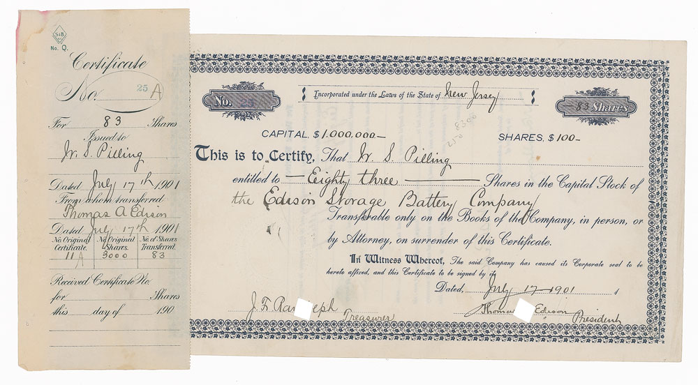 Partly-printed DS, signed “Thomas [A.] Edison, President,” one page, 11.5 x 7, July 17, 1901. Stock certificate issued to W. S. Pilling for “Eighty three Shares in the Capital Stock of the Edison Storage Battery Company.” Signed at the conclusion by Edison with his classic ‘umbrella’ signature and countersigned by John F. Randolph as the company’s treasurer. The receipt is also affixed to the left edge. Three vertical folds (one passing through end of the signature), and expected cancellation cuts and holes affecting the signature area (hole punched through the final letter of his first name and presumed middle initial, and thin cuts present but not affecting its appearance), otherwise fine condition. The Edison Storage Battery Company was organized in New Jersey on May 27, 1901, to develop, manufacture, and sell the alkaline storage battery that Edison had developed, which was used for mining lamps, train lighting and signaling, submarines, electric vehicles. A clean and attractive document. Pre-certified PSA/DNA and RR Auction COA.