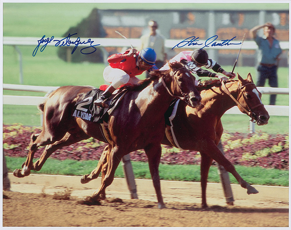 Color satin-finish 14 x 11 photo of of Alydar and Affirmed neck and neck, signed in blue felt tip by Steve Cauthen and Jorge Velasquez. In fine condition. Pre-certified Steve Grad/PSA/DNA and RR Auction COA.