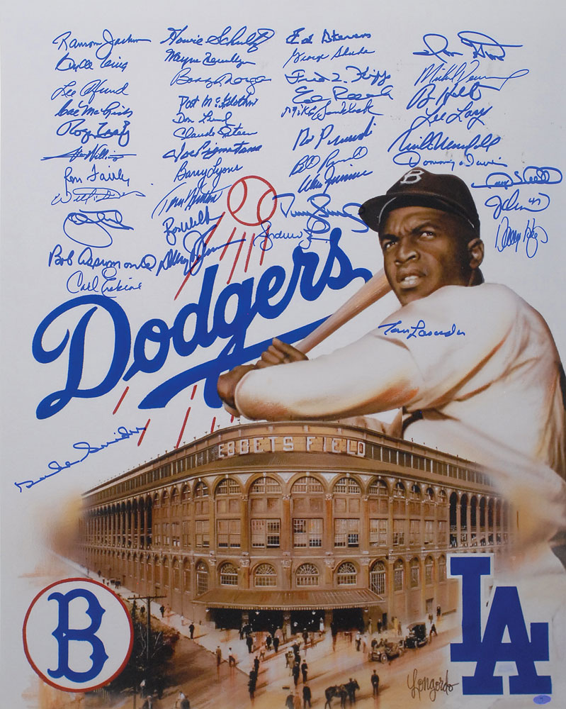 Color satin-finish 16 x 20 composite photo of Jackie Robinson and Ebbets Field, signed in blue felt tip by 43 former Dodgers including Duke Snider, Tom Lasorda, Barry Lyons, Joe Pignatano, Howie Schultz, Ransom Jackson, and Carl Erskine. In fine condition, with a bit of scattered light soiling to upper right. Pre-certified Steve Grad/PSA/DNA and RR Auction COA.