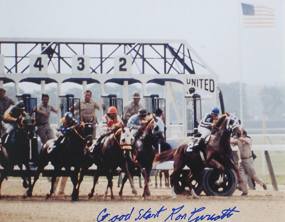 Two color glossy 9.25 x 7.25 photos of Turcotte atop Secretariat in the Belmont, each signed in blue felt tip, with Turcotte adding “Good Start” to one and “Great finish,” to the other. Double-matted with a commemorative plaque to an overall size of 14 x 24. In fine condition. Pre-certified Steve Grad/PSA/DNA and RR Auction COA.