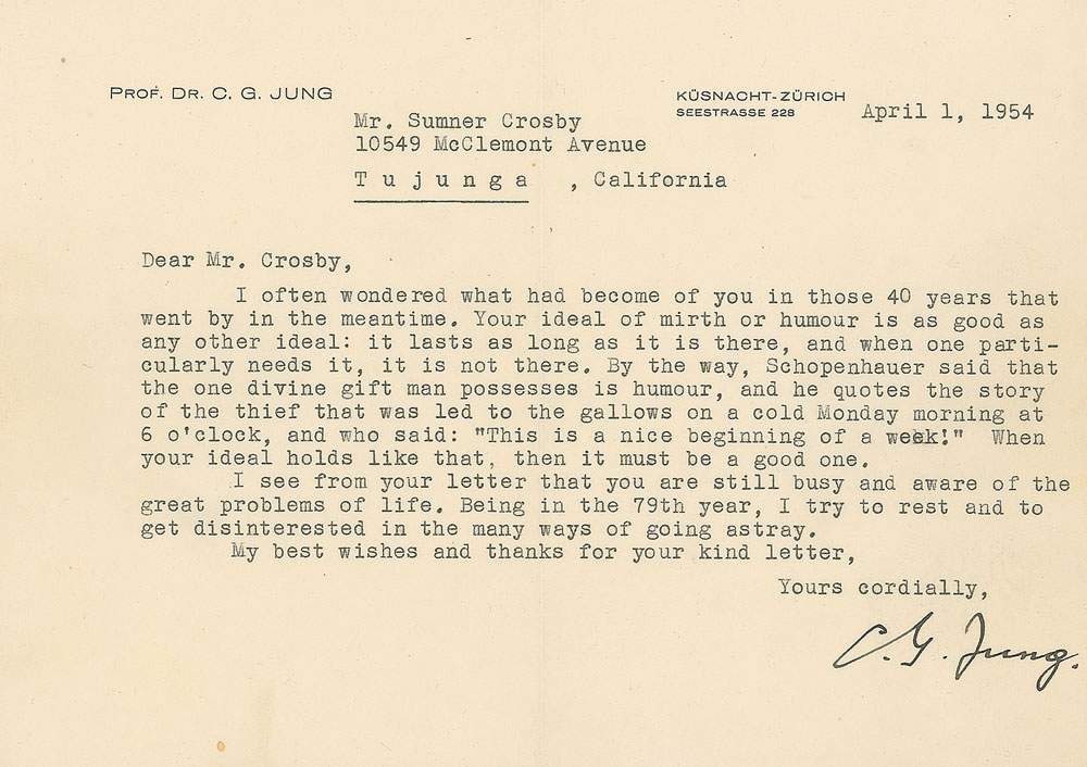 TLS signed “C. G. Jung,” one page, 8.25 x 5.75, personal letterhead, April 1, 1954. Letter to medieval art historian Summer Crosby. In full: “I often wondered what had become of you in those 40 years that went by in the meantime. Your ideal of mirth or humour is as good as any other ideal: it lasts as long as it is there, and when one particularly needs it, it is not there. By the way, Schopenhauer said that the one divine gift man possesses is humour, and he quotes the story of the thief that was led to the gallows on a cold Monday morning at 6 o’clock, and who said: ‘This is a nice beginning of a week!’ When your ideal holds like that, it must be a good one. I see from your letter that you are still busy and aware of the great problems of life. Being in the 79th year, I try to rest and to get disinterested in the many ways of going astray.” In fine condition. Accompanied by the original mailing envelope.