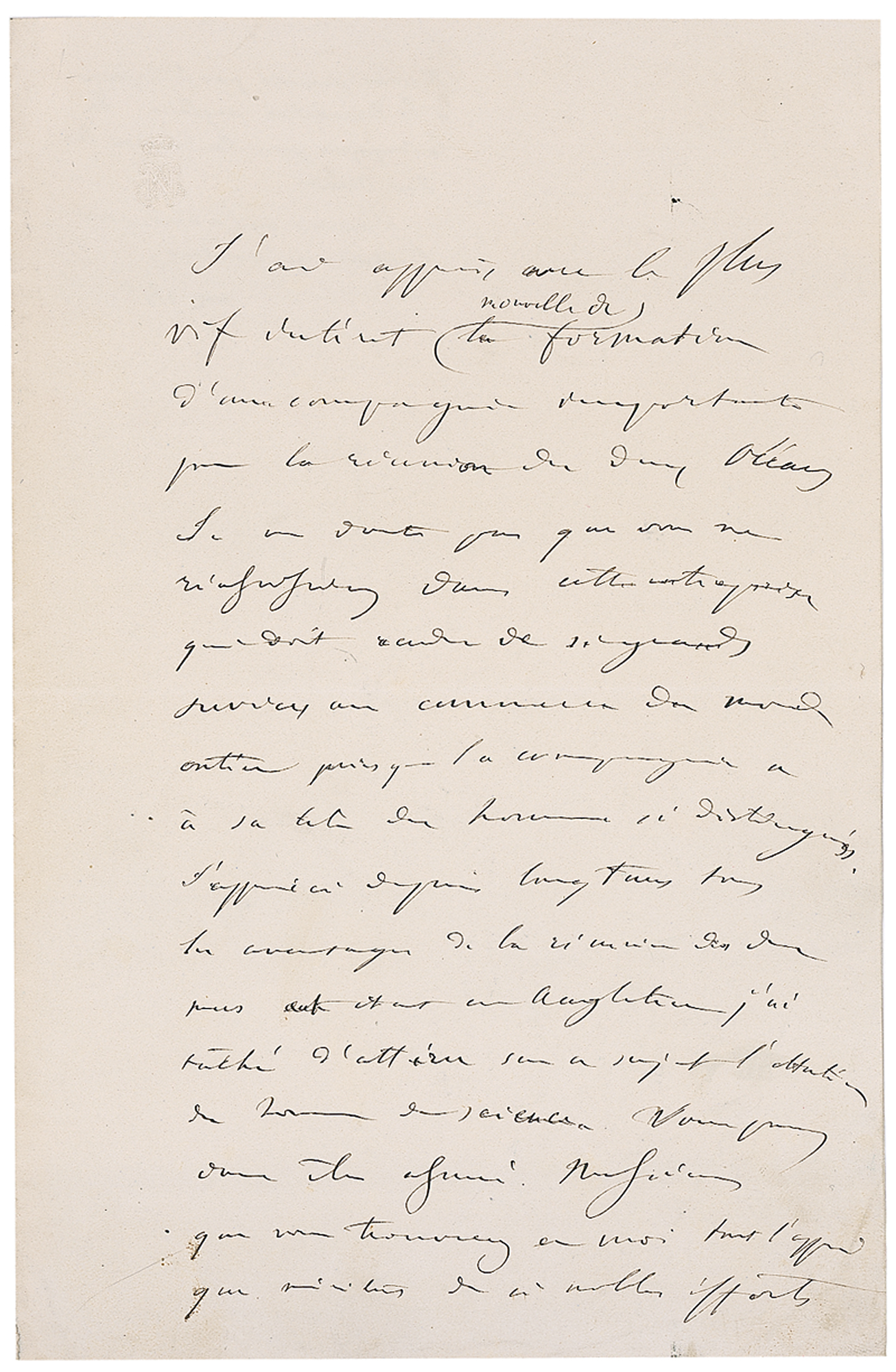 President of the French Second Republic and, the ruler of the Second French Empire (1808-1873). Partial autograph manuscript, in French, one page with his embossed initials and imperial crown, 5.25 x 8, of part of a speech given in 1853. Manuscript reads, in full (translated): "With the very greatest interest I have received the news of the formation of an important company for the uniting of the two Oceans. I have no doubt that you will succeed in this great enterprise which will render such great service to the common good of the whole world because the company is headed by such distinguished men. For some time I have been aware of all the advantages of uniting the two seas. When I was in England I tried to draw the attention of men of science to this subject. You may thus be assured, Gentlemen, that you will find in me all the support that such noble efforts deserve." On the reverse of the second integral page, the editor of the official government newspaper Le Moniteur has written, in French, (translated): "Speech given by the Emperor to the English Depuation of the Company for the Joining of the Two Oceans. The Emperor wrote it out for me for insertion into the Moniteur. March 1853." In fine condition, with a few light creases and thin adhesive remnant to reverse of second page. In 1846, during exile in England, Napoleon III wrote a pamphlet titled: Canal of Nicaragua: Or, A Project to Connect the Atlantic and Pacific Oceans by Means of a Canal. He embarked on a program of canal building in France and encouraged 'men of science,' notably Louis Pasteur to become involved.