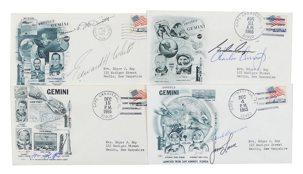 Collection of four FDCs, each with a cachet honoring a different Gemini mission, each signed in ink or felt tip by the mission’s crew members. Signers are: Edward H. White II and James McDivitt (Gemini 4); Gordon Cooper and Charles Conrad (Gemini 5); Tom Stafford and Wally Schirra (Gemini (6); and Frank Borman and James Lovell (Gemini 7). In fine condition, with some light contrast to Schirra’s signature. Pre-certified Steve Zarelli and RR Auction COA.