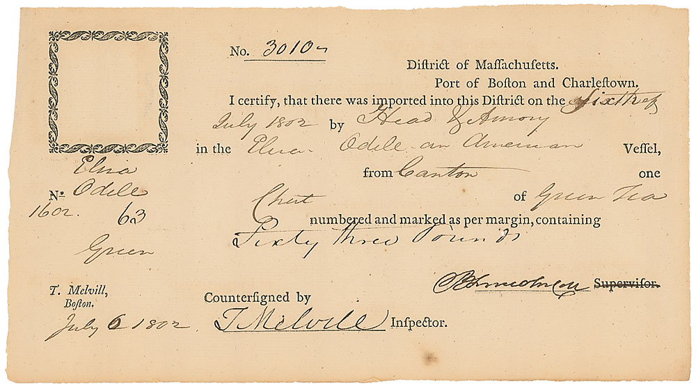 Major general in the Continental Army (1733-1810) during the American Revolutionary War, known as the officer who formally accepted the British surrender at Yorktown. Partly-printed DS, signed “B. Lincoln Con,” one page, 9.5 x 5.25, July 6, 1802. As Collector of the port of Boston and Charlestown, Lincoln signs to attest that “one Chert of Green Tea, numbered and marked as per margin, containing Sixty three pounds” was imported by the Eliza Odelle of Canton. Countersigned by Massachusetts Patriot Thomas Melvill, who had been an active participant in the Boston Tea Party nearly three decades earlier. In fine condition, with one small bit of ink erosion, not affecting the overall appearance. An attractive document with interesting Revolutionary association. Pre-certified PSA/DNA and RR Auction COA.