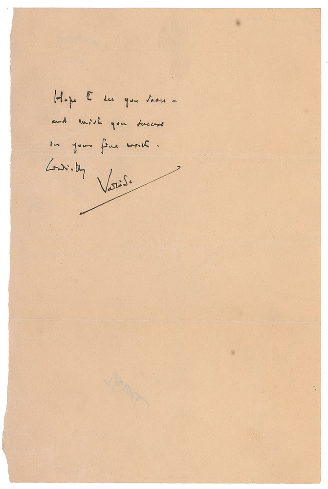 Innovative French-born American composer (1883–1965) who invented the term ‘organized sound.’ ANS signed “Varese,” one page, 5.5 x 8.5, no date. Brief note of encouragement. In full: “Hope I see you soon—and wish you success in your fine work.” Scattered creases and light overall toning, otherwise fine condition. RR Auction COA.
