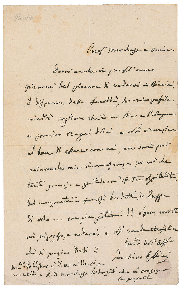 Important Italian composer (1792–1868) who became one of the seminal figures in the history of opera with such repertoire staples as The Barber of Seville and William Tell. ALS in Italian, one page, 8.25 x 8.5, no date but circa late 1830s. Rossini regrets not being able to take advantage of the hospitality of his ‘dear marquis and friend’ at Rimini this year—his health obliges him instead to take the waters at a spa, which will deprive him of the famous brodetti [fish soups] that he loves so much. Also addressed in Rossini’s hand on the reverse of the second integral page. Intersecting folds and scattered light staining, otherwise fine condition. A lovely reference to the composer’s well known love for fine food. Pre-certified PSA/DNA and RR Auction COA.
