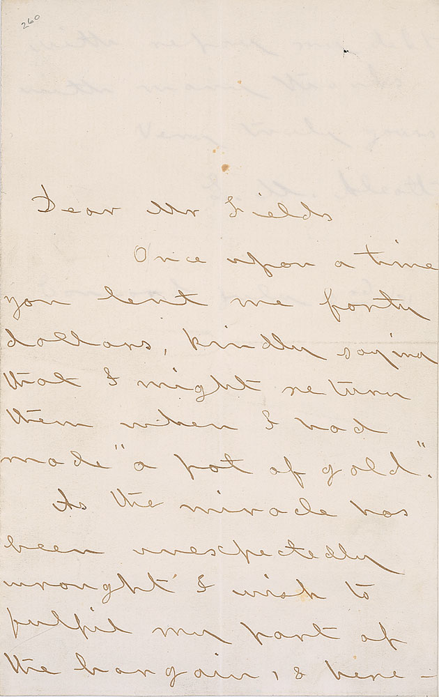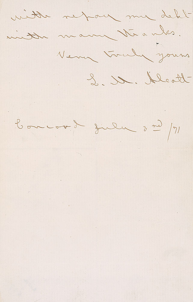 Choice ALS signed “L. M. Alcott,” two pages on two adjoining sheets, 4.75 x 7.5, July 3, 1871. Letter to publisher James Thomas Fields. In full: “Once upon a time you lent me forty dollars, kindly saying that I might return them when I had made ‘a pot of gold.’ As the miracle has been unexpectedly wrought, I wish to fulfill my part of the bargain, & herewith repay my debt with many thanks.” In fine condition, with central vertical and horizontal folds (one vertical fold passing through first letter of the signature). Due to her father’s chronic unemployment, Alcott grew up in poverty and her family incurred numerous debts—she saw her career as a writer as an economic necessity, driven by a feeling of duty to her family to provide economic security. Alcott had published Little Men earlier in 1871, and by June had sold over 50,000 copies—this tremendous success earned her the “pot of gold” and provided her with the ability to pay back her debt. In addition to its exquisite content, Alcott letters are very rare—this being just the third we have offered. Pre-certified PSA/DNA and RR Auction COA.