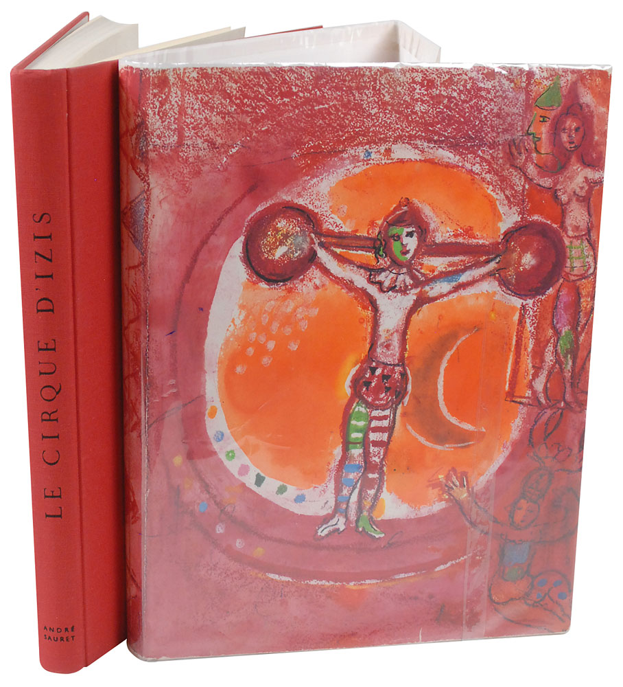Signed book: Le Cirque D’Izis. Monte Carlo: Andre Sauret, 1965. Hardcover with dust jacket, 10 x 13, 171 pages. Signed and inscribed on the title page in black ballpoint, “Pour mon ami Jean, Chagall 1966,” with Chagall adding a great color-highlighted sketch of a man holding a flowering branch, more than likely Jean. Autographic condition: fine. Book condition: VG+/VG+. A wonderfully personal and well-detailed original artwork. Pre-certified PSA/DNA and RR Auction COA.