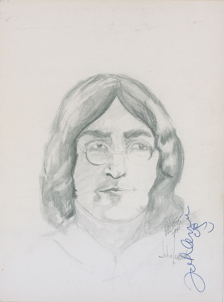 Two original sketches, both done by an admirer who has signed both of the works as well as adding the names of each subject, on individual off-white 9 x 12 sheets of sketch paper. One, a pencil sketch of Lennon sporting long hair and his trademark round glasses, signed in person vertically in blue ballpoint, “John Lennon,” adding a quick self-caricature under his signature. A pencil notation on the reverse, presumably by the artist, states that Lennon’s signature was obtained at the “Carlyle Hotel, Sgt. Pepper Premiere Night, 11-17-74.” Interestingly, the collector noted that Lennon said “you sketched me, I’ll sketch for you.”; the other, a pencil and ink sketch of a bearded McCartney, signed in person in black ballpoint. The McCartney signature was obtained on November 23, 1974, at the Stanhope Hotel in New York City. In fine condition. Accompanied by a color candid of McCartney taken at the time of signing, and a color candid of Lennon taken on April 8, 1975. Pre-certified REAL.