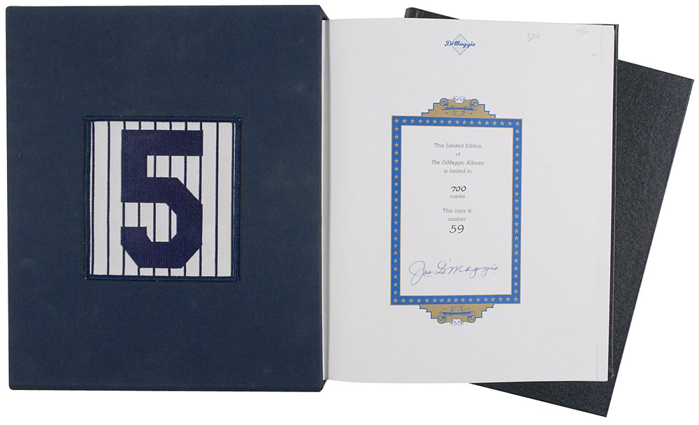 Signed book: The DiMaggio Albums, Volumes I & II. First edition, limited issue, numbered 59/700. NY: G. P. Putnam’s Sons, 1989. Two hardcover volumes in slipcase, 9.25 x 11.25. Signed in blue ballpoint on the colophon of Volume I. In fine condition. Pre-certified Steve Grad/PSA/DNA and RR Auction COA.