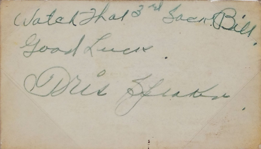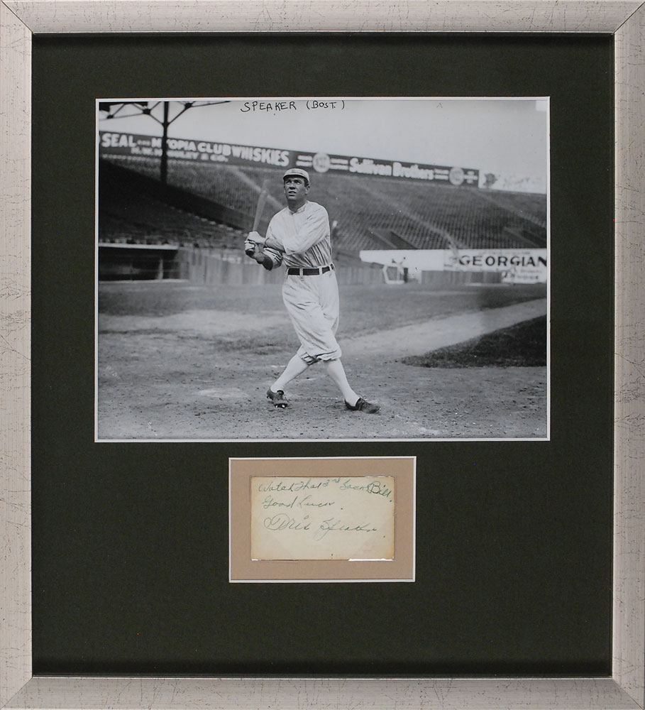 Vintage fountain pen signature and inscription, “Watch that 3rd sack, Bill. Good luck, Tris Speaker,” on an off-white 3.5 x 2 card. Nicely matted and framed with a crystal-clear photo of the center fielder to an overall size of 15.75 x 17. Light overall toning and soiling, otherwise fine condition. Pre-certified Steve Grad/PSA/DNA and RR Auction COA.