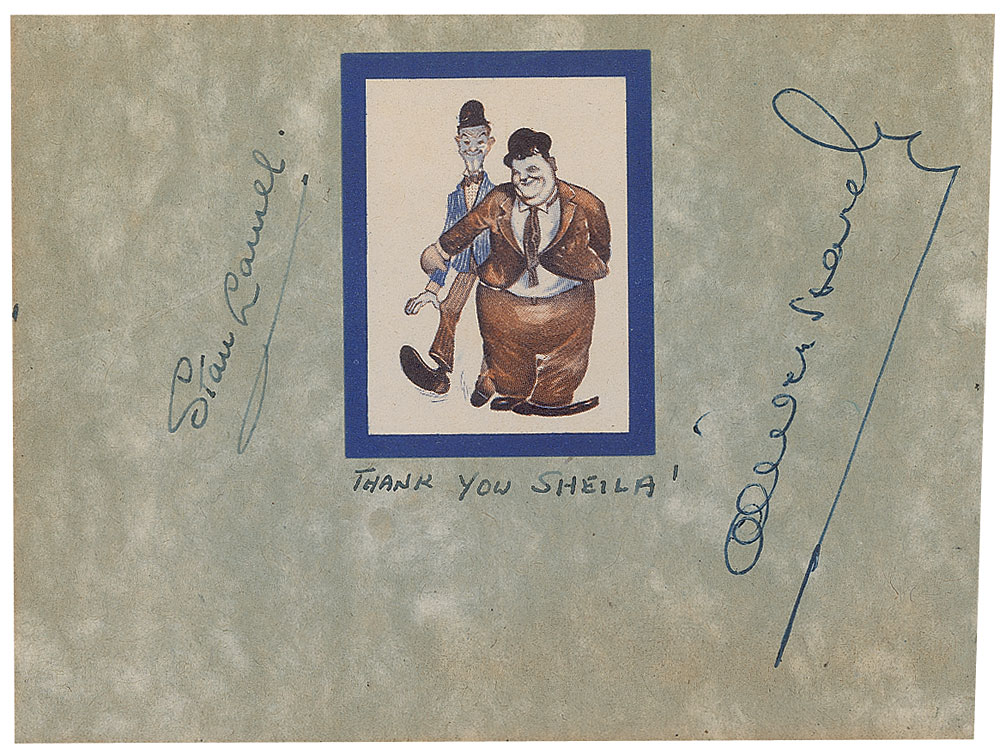 Vintage fountain pen signature and inscription, “Thank you Sheila! Stan Laurel,” and a ballpoint signature, “Oliver Hardy,” on a gray-and-white marbled 5.25 x 4 album page, with a small color caricature of the pair affixed near the top of the page. In fine condition. Pre-certified PSA/DNA and RR Auction COA.
