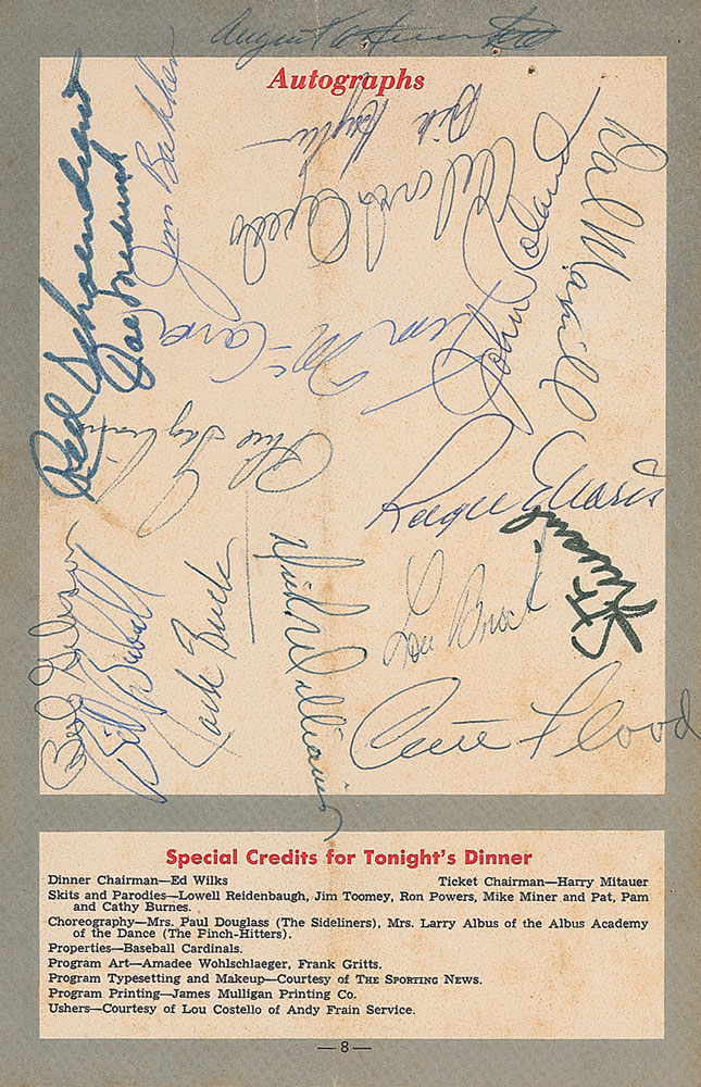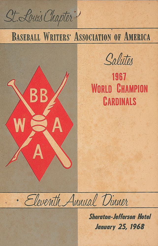 Program for the Baseball Writers’ Association of America St. Louis Chapter’s dinner honoring the 1967 World Champion Cardinals, January 25, 1968, 5.5 x 8.5, signed on the back cover in felt tip and ballpoint by 18 members of the team and guests at the event. Signers include: Roger Maris, Stan Musial, Bob Gibson, Red Schoendienst, Joe Medwick, Curt Flood, Lou Brock, Jack Buck, Orlando Cepeda, Dick Williams, Dal Maxvill, Dick Hughes, Tim McCarver, and Phil Gagliano. In very good condition, with a central vertical fold and moderate foxing. Pre-certified Steve Grad/PSA/DNA and RR Auction COA.