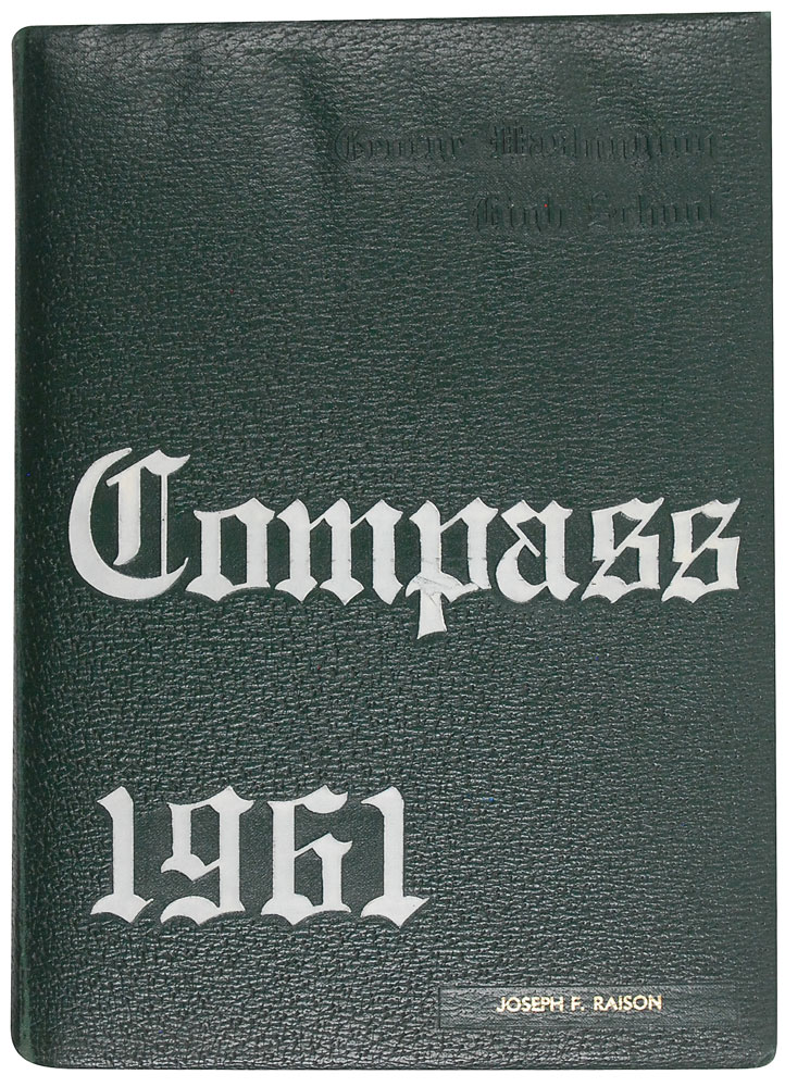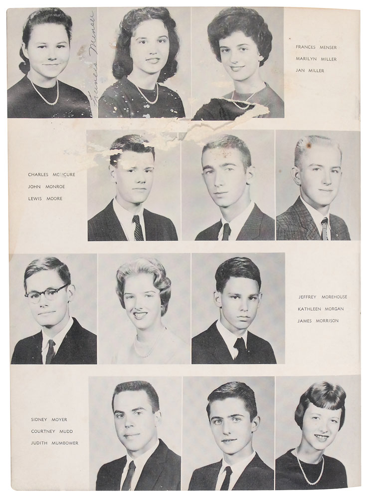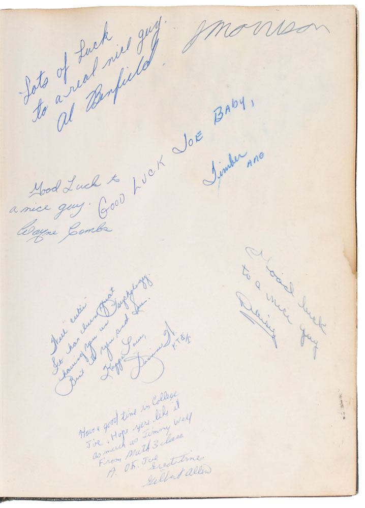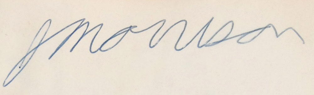 Original copy of the Compass, the annual for George Washington High School, Alexandria, Virginia (Volume 26), for 1961, hardcover, 8 x 10.75, 199 pages, signed in blue ballpoint at the top of the first page, “J. Morrison.” Morrison’s clean-cut image is located in the senior class photos. Remainder of the book bears many signatures and inscriptions to the book’s original owner. In good condition, with moderate to heavy areas of dampstaining and foxing throughout the book, resulting in some pages sticking together and areas of paper loss. However, Morrison’s page is largely unaffected by the exposure, with only mild dampstaining and rippling to page. This was the second high school Morrison attended, having transferred from Alameda High School in California to George Washington, due to his father being stationed in the Navy. Difficult to find even in in unsigned editions, this copy, boasting a very early Morrison signature, is the first signed yearbook we have ever offered. Pre-certified Roger Epperson/REAL and RR Auction COA.