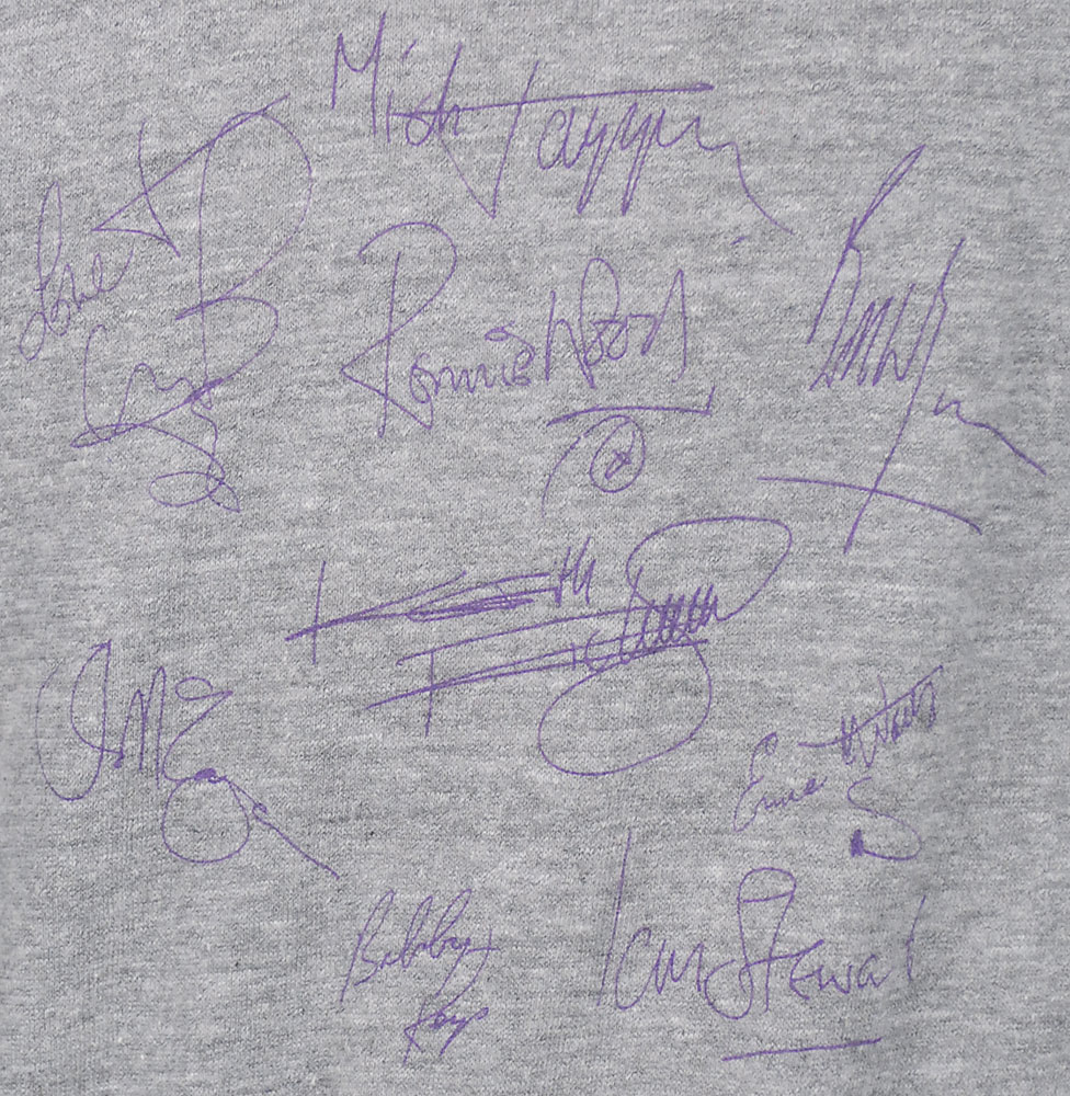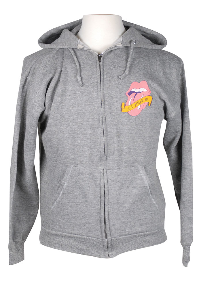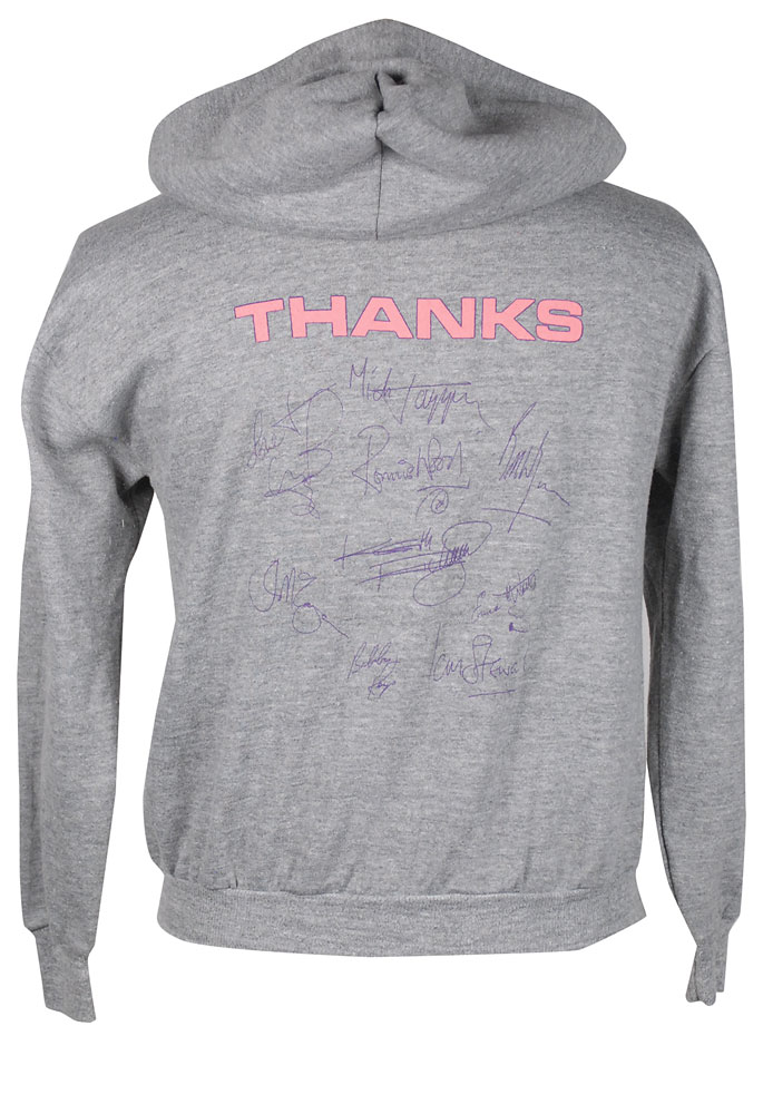 Sweatshirt from the band’s 1981 US tour. Gray hooded sweatshirt features a zip-up front, the tour logo on the left breast, and “Thanks,” printed on the top of the reverse, along with printed signatures of all five band members, as well as their supporting musicians. In fine condition. RR Auction COA.