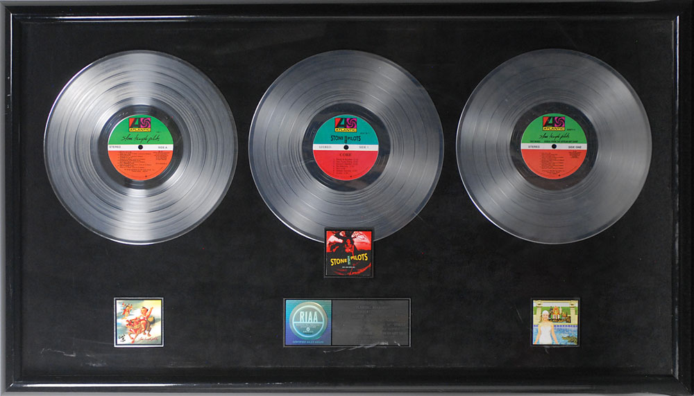 A ‘Bar hologram’ RIAA multi-platinum sales award presented to Atlantic Records for sales of the Stone Temple Pilots albums Core, Purple, and Tiny Music…Songs From the Vatican Gift Shop,’ framed with three discs and small reproductions of the cover art to an overall size of 42 x 24. In very fine condition. RR Auction COA.