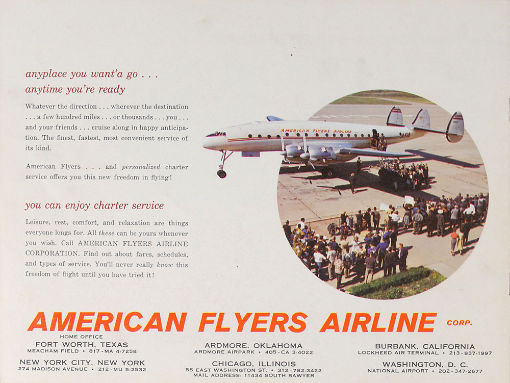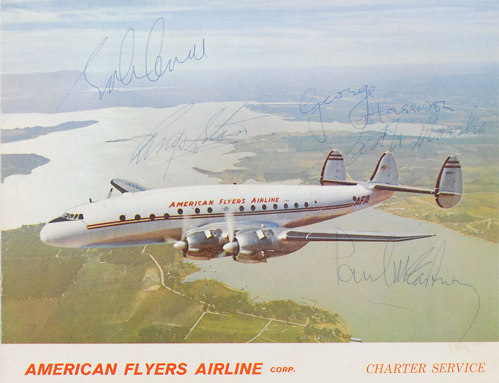 American Flyers Airline Corp. booklet depicting a plane in flight, 11 x 8.25, signed on the front cover in blue ballpoint by John Lennon, Paul McCartney, George Harrison, and Ringo Starr, with an inscription added in an unknown hand, “Best to Marsha.” In fine condition. The Beatles chartered American Flyers for their both their first full US tour in 1964 and their return in 1965, flying from city to city as they spread Beatlemania from the shores of Great Britain to the heartland of America. Pre-certified Roger Epperson/REAL and RR Auction COA.