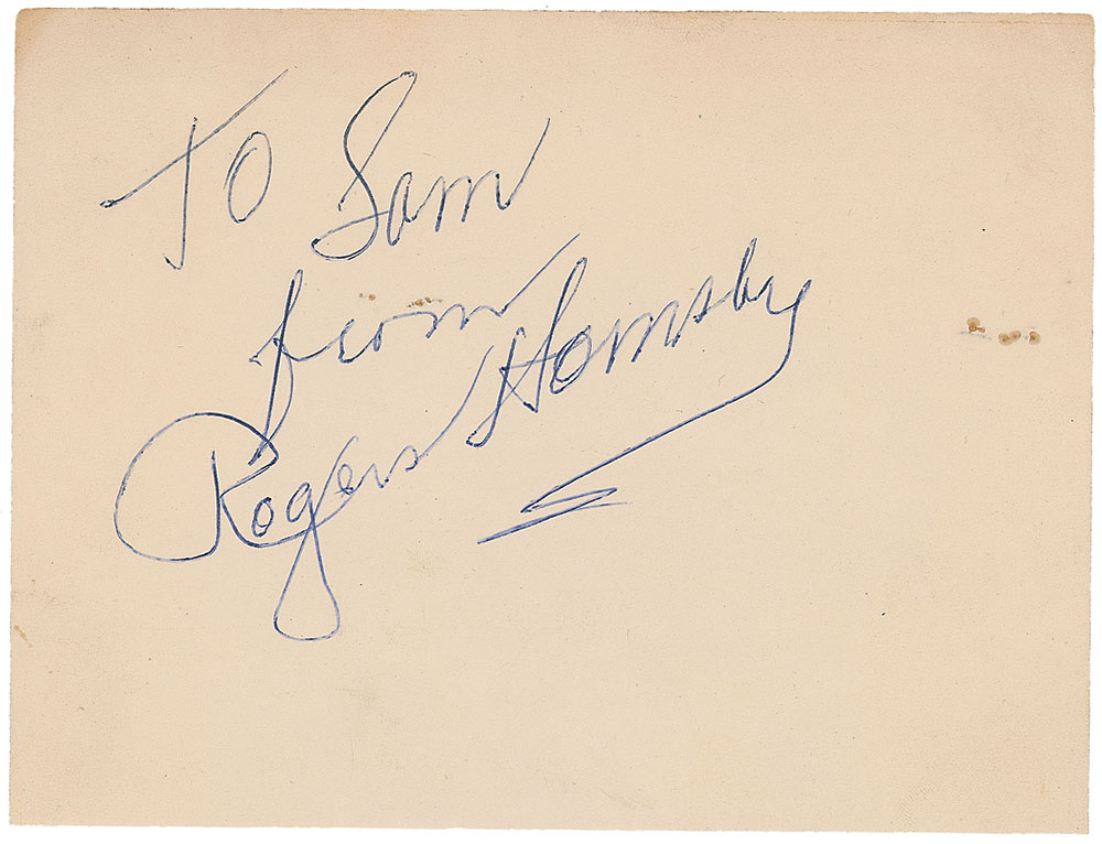 Legendary second baseman and Hall of Famer (1896–1963) known as one of the best hitters of all-time, finishing his career with a batting average of .358. Ballpoint signature and inscription, “To Sam, from Rogers Hornsby,” on an off-white 5.75 x 4.5 album page. In fine condition, with a few tiny stains. Pre-certified Steve Grad/PSA/DNA and RR Auction COA.