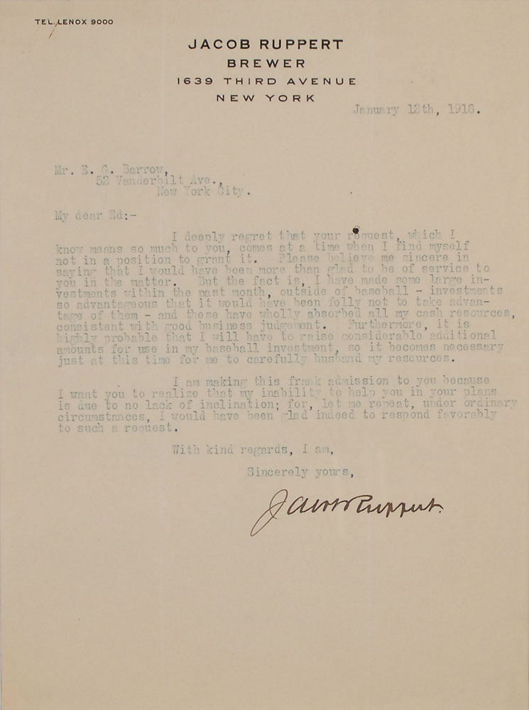 "Writing to Barrow three years before purchasing Babe Ruth for $100,000, Ruppert discusses raising “considerable additional amounts for use in my baseball investment”"