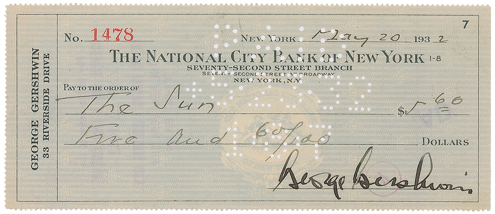 Choice personal check, 6.5 x 2.75, filled out in another hand and boldly signed by Gershwin, payable to The Sun for $5.60, May 20, 1932. In fine condition, with expected bank stamps and cancellation holes (one stamp subtly affecting a couple letters of his last name). Accompanied by a small unsigned photo. Pre-certified PSA/DNA and RR Auction COA.
