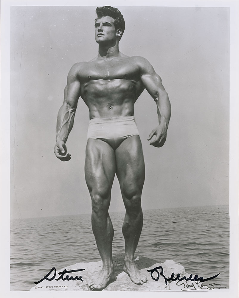 Impressive glossy 8 x 10 photo of the muscular actor standing atop a rock at the seashore, signed in black felt tip. In very fine condition. Pre-certified PSA/DNA and RR Auction COA.