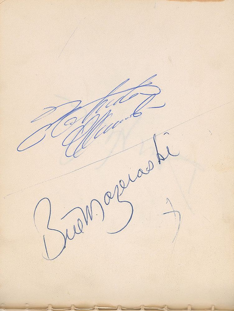 Vintage ballpoint signature, “Roberto Clemente,” on an off-white 6 x 4.5 album page, also signed by Pirates teammate Bill Mazeroski. Page is still housed in its original 6 x 5 softcover autograph album. Album also bears a felt tip signature of John Glenn. In fine condition. Pre-certified Steve Grad/PSA/DNA and RR Auction COA.
