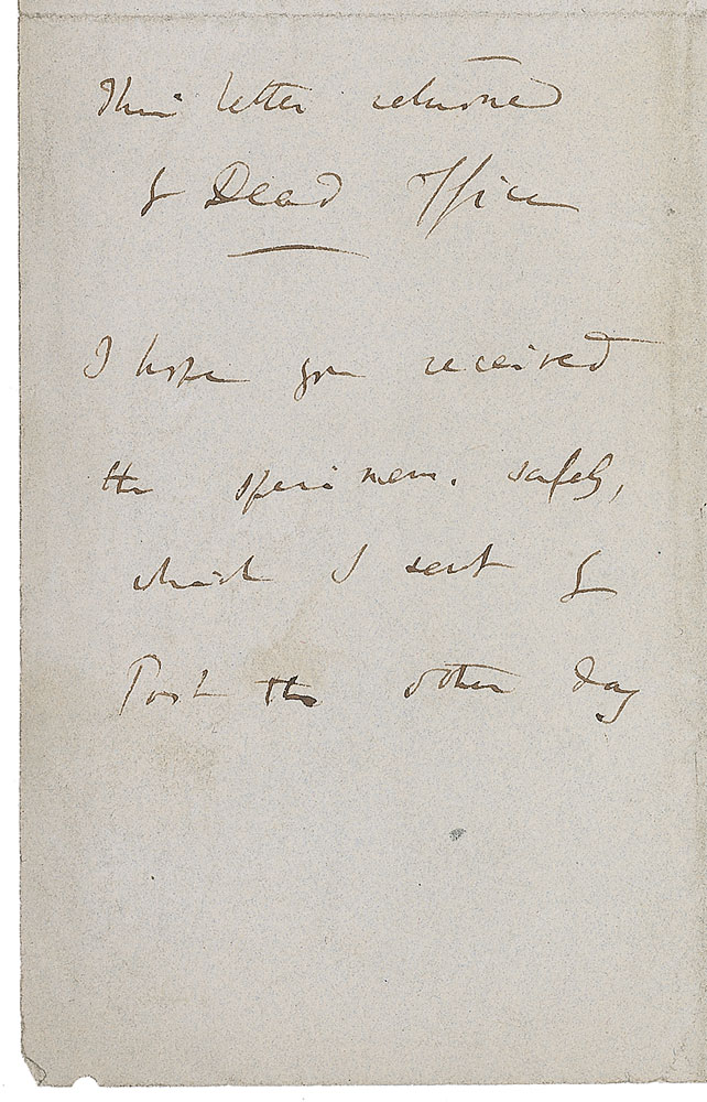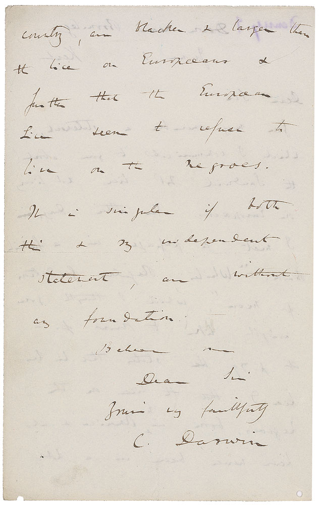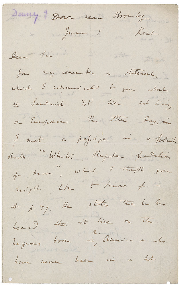 ALS signed “C. Darwin,” one page both sides, 5 x 7.75, June 1 [1844]. Letter to an unidentified gentleman, most likely entomologist Henry Denny. In full: “You may remember a statement, which I communicated to you about the Sandwich Islands lice not living on Europeans. The other day, I met a passage in a foolish book: ‘Whites Regular Gradation of Men,’ which I thought you might like to know of. At p. 79 he states that he has heard that the lice on the Negroes born in N. America and who have never been in a hot country, are blacker and larger than the lice on Europeans and further that the European lice seem to refuse to live on the Negroes. It is singular if both this and my independent statement, are without any foundation.” On the reverse of the second integral page, Darwin writes: “This letter returned by Dead Office. I hope you received the specimens, safely, which I sent by Post the other day.” In fine condition, with central horizontal and vertical folds, two small punch holes along bottom edge, and a purple pencil notation to top of first page.
