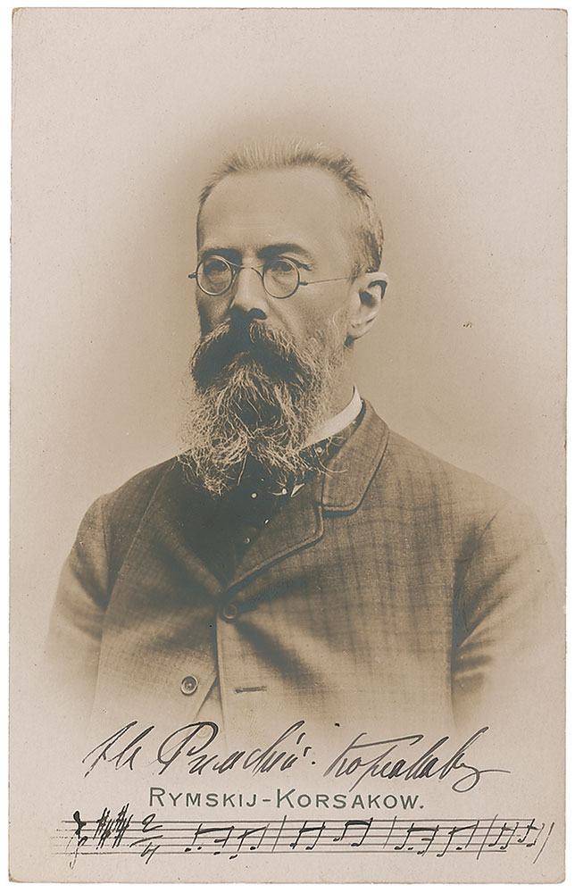Eminent Russian composer (1844–1908) best known for such brilliantly orchestrated works as Scheherazade and for operatic staples like ‘Sadko,’ ‘The Tale of Tsar Saltan,’ and ‘The Golden Cockerel.’ Vintage matte-finish 3.5 x 5.5 Russian postcard photo, signed in fountain pen, with a four-bar AMQS in 2/4 time added under his signature. In fine condition, with some mounting remnants to reverse. An exemplary photo in pristine condition. Pre-certified John Reznikoff/PSA/DNA and RR Auction COA.