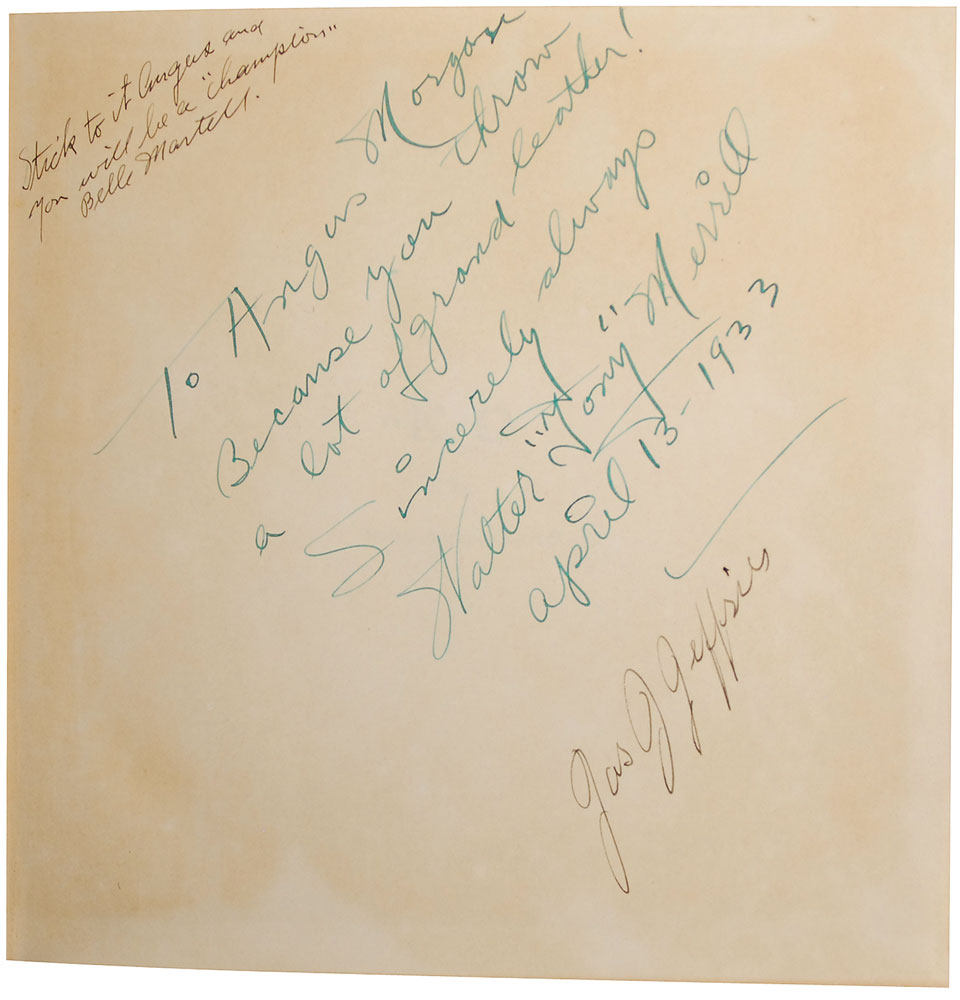 Signed book: K. O. by Walter Anthony Merrill. First edition, limited issue, numbered 47/1000. USA: Keystone Publishing, 1933. Hardcover, 9 x 9, 98 pages. Signed on the first free end page in fountain pen, “Jas. J. Jeffries.” Also signed and inscribed in fountain pen, “To Angus Morgan, Because you throw a lot of grand leather! Sincerely always, Walter ‘Tony’ Merrill, April 13-1933,” and “Stick it to Angus and you will be a ‘champion,’ Belle Martell.” Autographic condition: scattered toning to signed page, otherwise fine. Book condition: VG/None, with moderate foxing to cover. Martell was the first woman boxing referee in the country, and Morgan was a boxer who fought in a few bouts during 1934 at the Olympic Auditorium in California.
