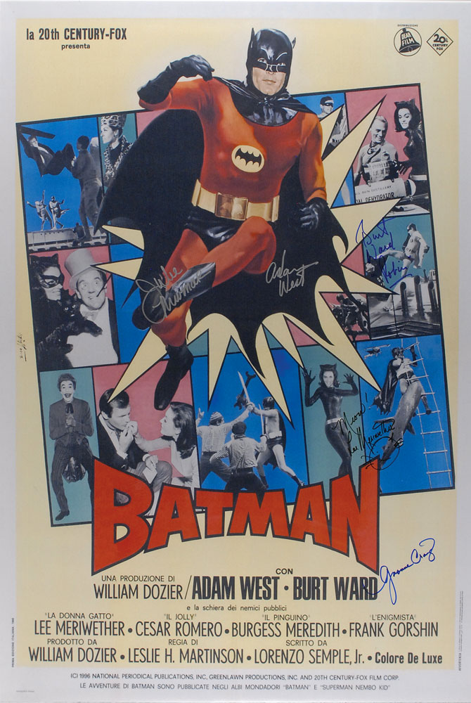 Color 27 x 40 reproduction Italian movie poster for Batman, signed in silver ink by Adam West and Julie Newmar, in blue felt tip by Burt Ward and Yvonne Craig, and in black felt tip by Lee Meriwether. Rolled and in fine condition. Pre-certified PSA/DNA and RR Auction COA.