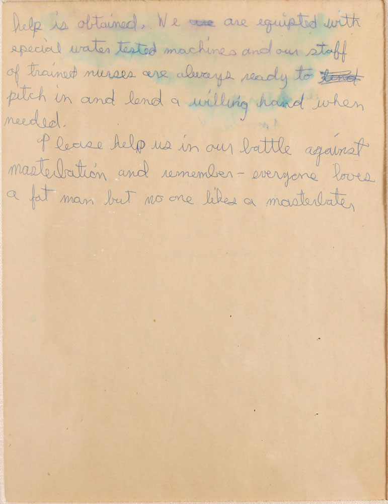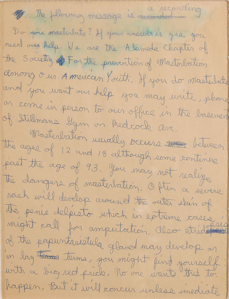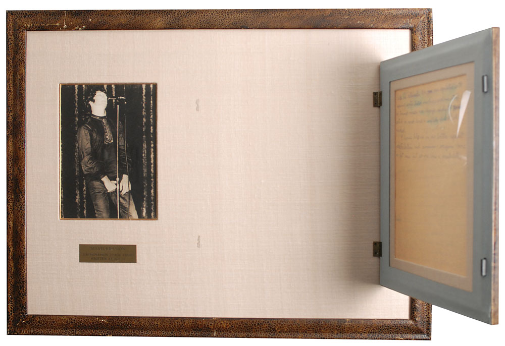 Handwritten essay about masturbation composed by Morrison at age 14, one page both sides, 8 x 10.5, no date but circa 1957. In full (spelling and grammar retained): “The following message is a recording. Do you masterbate? If your answer is yes you need our help. We are the Alameda Chapter of the Society for the Prevention of Masterbation among our American Youth. If you do masterbate and you want our help you may write, phone or come in person to our office in the basement of Stillmans Gym on Redcock Ave. Masterbation usually occurs between the ages of 12 and 13 although some continue past the age of 93. You may not realize the dangers of masterbation. Often a severe rash will develop around the outer skin of the penis delpisto which in extreme cases might call for amputation. Also, stridopsis of the papuntasistula gland may develop or in lay terms, you might find yourself with a big red prick. No one wants this to happen. But it will occur unless imediate help is obtained. WE are equipted with special water tested machines and our staff of trained nurses are always ready to pitch in and lend a willing hand when needed. Please help in our battle against masterbation and remember—everyone loves a fat man but no one likes a masterbator.” Cloth-matted and framed with an image of Morrison on stage and small plaque to an overall size of 29.5 x 23; the essay is framed on a hinge so that both sides can be seen. In very good condition, with overall toning and moderate dampstaining to the top (affecting appearance but not legibility). Morrison wrote this essay in collaboration with his high school friend, Fud Ford, and it was originally acquired through the Christie’s sale of Ford’s collection. A hilarious example of Morrison’s wit and affinity for controversy at an early age, and one of the only known surviving manuscripts from The Doors’ frontman from this early period. Pre-certified Roger Epperson/REAL and RR Auction COA.