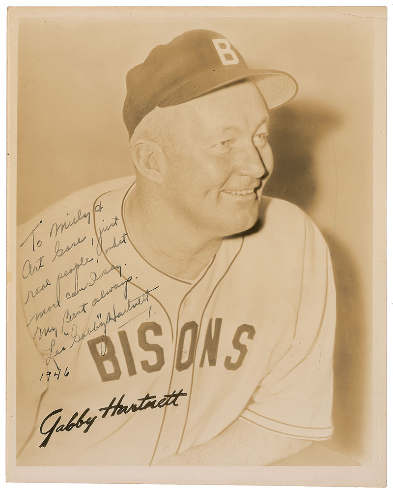Uncommon vintage glossy 8 x 10 photo of Hartnett as manager of the Buffalo Bisons, signed and inscribed in fountain pen, “To Milly & Art Gore, just real people, what more can I say. My best always, Leo ‘Gabby’ Hartnett,” with the date, “1946,” added below in another hand. In fine condition, with scattered creases. Gore served as a National League umpire from 1947 to 1956, officiating two World Series and two All-Star Games. Pre-certified Steve Grad/PSA/DNA and RR Auction COA.