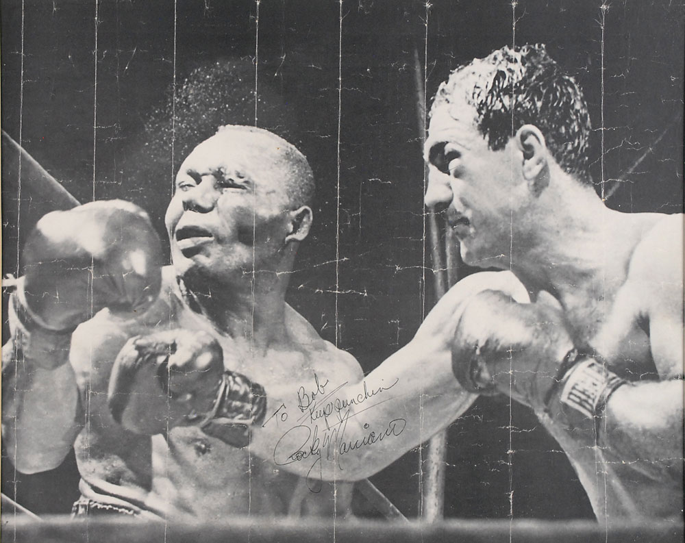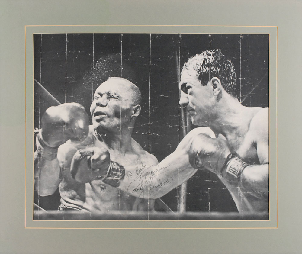 Huge vintage 19.5 x 15.5 image of Marciano landing a thunderous punch to the face of Jersey Joe Walcott in their 1952 championship bout, signed and inscribed in black ballpoint, “To Bob, Keep punchin, Rocky Marciano.” Photo is affixed to a mount and matted to an overall size of 25.25 x 21. In very good condition, with vertical folds, one through a single letter of signature, and scattered noticeable wrinkles and creases from adhesive. Accompanied by a letter of authenticity from James Spence. Oversized. Pre-certified Steve Grad/PSA/DNA and RR Auction COA.