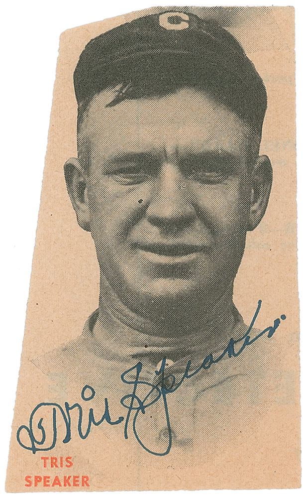 Seventh player elected to the Baseball Hall of Fame (1888–1958) and the greatest center fielder of his day. Vintage 2 x 3.5 magazine photo, boldly signed in fountain pen. In fine condition, with irregular edges. Pre-certified Steve Grad/PSA/DNA and RR Auction COA.