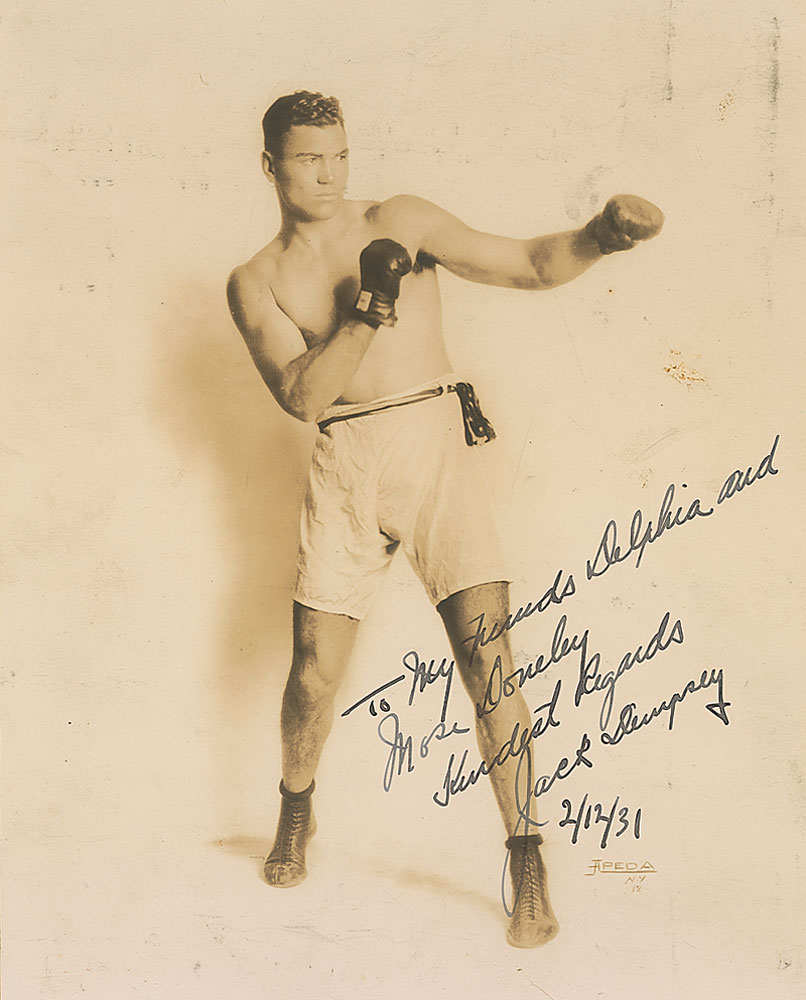 Vintage matte-finish 8 x 10 full-length photo of Dempsey throwing a left jab, signed and inscribed in fountain pen, “To my friends Dalphia and Mose Doneley, Kindest regards, Jack Dempsey 2/12/31.” Scattered soiling and surface marks and a small repaired tear to bottom edge, otherwise fine condition. Pre-certified Steve Grad/PSA/DNA and RR Auction COA.